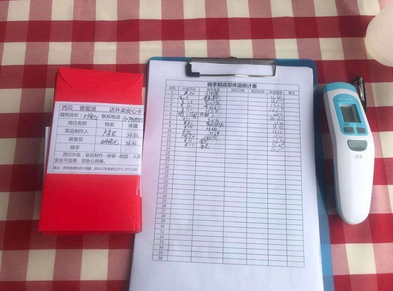為了保障顧客和員工的健康,深圳西貝要求所有上班前的員工都需每半小時測一次體溫,每一個小時集中進行洗手消毒,公司還為每一位員工配備了符合要求的防護口罩。不僅如此,來外賣取餐的騎手也和店員分割開在店門口取餐,減少人員之間相互交流與接觸,每個騎手取餐前,必須接受體溫測量,手部消毒,確認無誤,才可取餐。