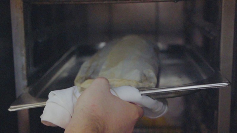 清蒸鱸魚是常見的粵式吃法,本期,四季酒店主廚畢柏克為吃貨們帶來別樣的鱸魚吃法——“烤紙包鱸魚”。他將魚進行腌制后,用烘焙用紙裹緊,在烤爐中烤制40分鐘。吸收了海鮮文蛤、白葡萄酒精華的魚肉緊實鮮嫩,在打開外包紙的那一刻,香氣四溢,讓人欲罷不能。如此烹法,也能最大限度保存魚的營養和鮮美。