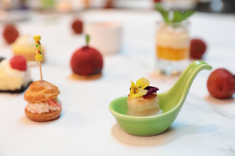 酒店餅房廚師長趙偉匠心獨運,使荔枝和傳統下午茶碰撞出別樣風情:芒果恰到好處的酸甜邂逅荔枝的宜人甘美,香芒荔枝慕斯杯里滿載的不就是夏天的專屬甜蜜;芝士蛋糕的醇厚滋味被荔枝的清爽巧妙平衡,多層次的口感讓人無限回味;當俏皮可人的荔枝被加入傳統甜品楊枝甘露,搭配冰涼爽口的荔枝雪芭,是妙趣橫生的獨特味覺體驗;法式焦糖燉蛋和荔枝的融合,恍若天成,是中西合璧的典范;日本帶子和荔枝的組合聽來不可思議,只有親試方能體會海陸鮮甜交匯的真意。