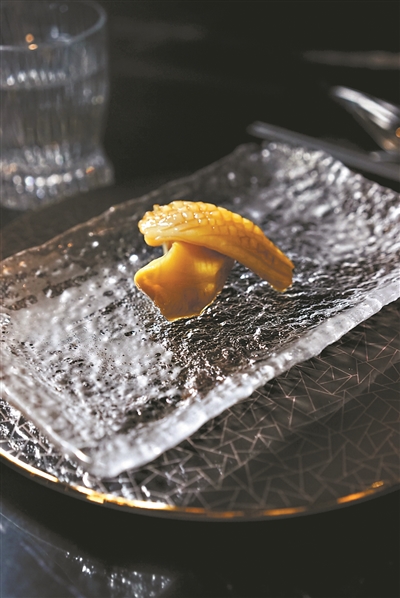 湯焯乃雞油焯響螺。1斤1只的響螺去殼與頭后,凈肉僅僅2兩。切成片狀的響螺經過定時低溫慢煮后,淋上剛剛滾起的熱雞油,上碟時,它旁邊跟著一灘其貌不揚的醬汁,那便是紫蘇醬。響螺配紫蘇,勾起人們對中秋的紫蘇炒田螺的味覺記憶。油焯的風味靈感源自蒜香骨這道傳統粵菜,取蒜香味結合魚露醬,融入花膠天婦羅之中。將花膠以天婦羅的方式展現,這也是大膽的嘗試。味焯的做法則讓人更熟悉,立馬想起前些年風靡廣州的鹵水火鍋來。獅頭鵝的鵝肝在鹵水里泡著溫泉,時間一到才起身,并不太咸,香濃恰好。還有汽焯,是用最當造的大黃花魚,將整個迷你小蒸籠搬到面前來,現蒸現吃,7分鐘,嫩度正好。火焯則是燒烤澳大利亞和牛肉的燒烤方式,這最原始的烹飪方式里夾著迷迭香和百里香的誘人香氣。而這每一道菜肴,僅僅數口的分量,道道位上,分量恰到好處,避免了餐桌上的浪費。