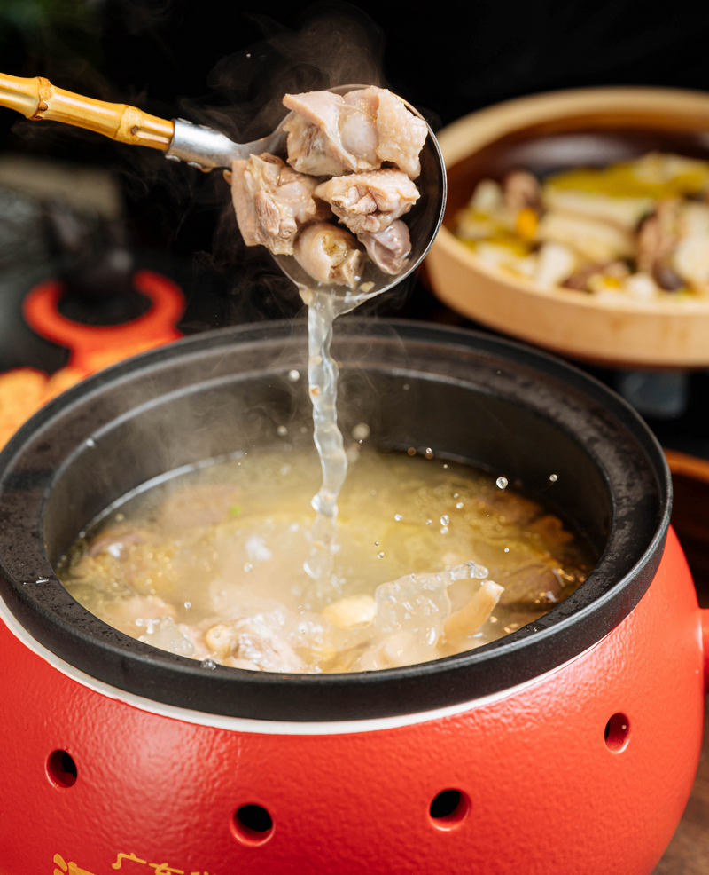以雞為主要烹飪食材,洞庭土雞館的湖南師傅創造出了不一樣的菜肴。每桌食客坐下,都少不得一碗暖乎乎的洞庭土雞湯來“開場”。它的登場也相當有氣勢,長沙紅磚窯特別定制的大湯鍋,內膽是紫砂構造,這樣的設計既是出于美觀,又是出于更長時間更有效保溫的效果。俗話說得好,工欲善其事必先利其器。土雞方面,師傅特別精選了湖南竹山雞,肉質的彈性略勝一籌,據介紹,竹山雞的養殖戶開放了大片山頭讓雞跑,放養時間足夠長,達到一年多,在如今快節奏的社會里已實屬難得。老雞加山泉水文火熬3個小時,并沒有其他的味道干擾,簡簡單單就是本味。