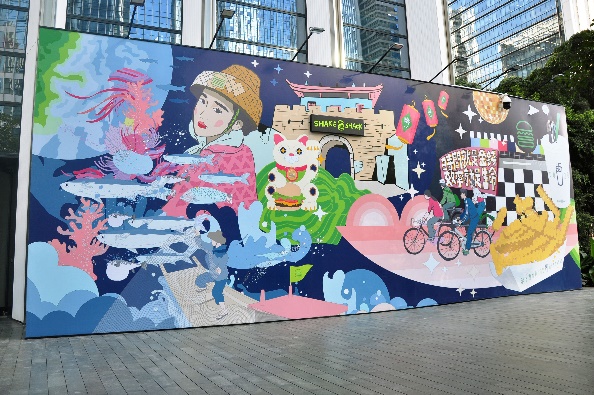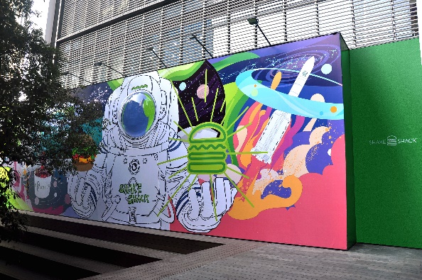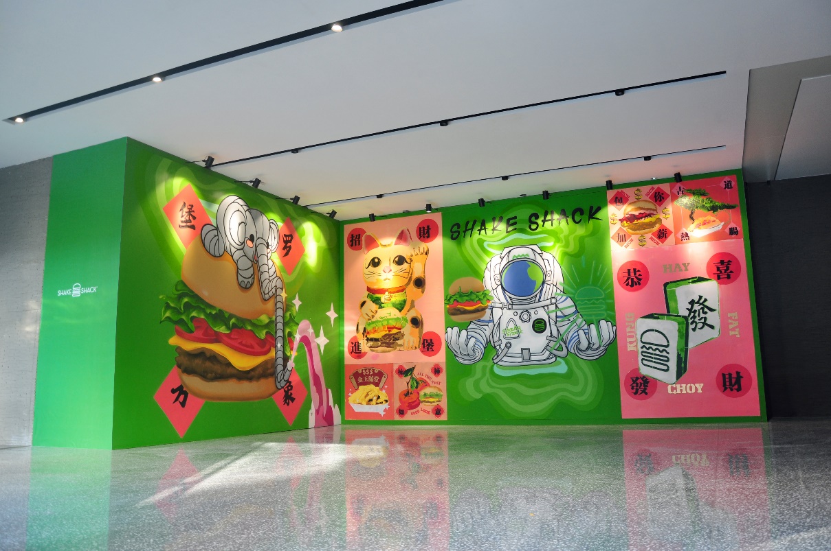 圍擋的室內部分采用創新的互動形式,由藝術家現場親自手繪完成的8幅單元涂鴉畫板組合而成。藝術家用摩登時尚的波譜藝術,向當地賓客們奉送出中國傳統的祝福及Shake Shack的活力熱情。