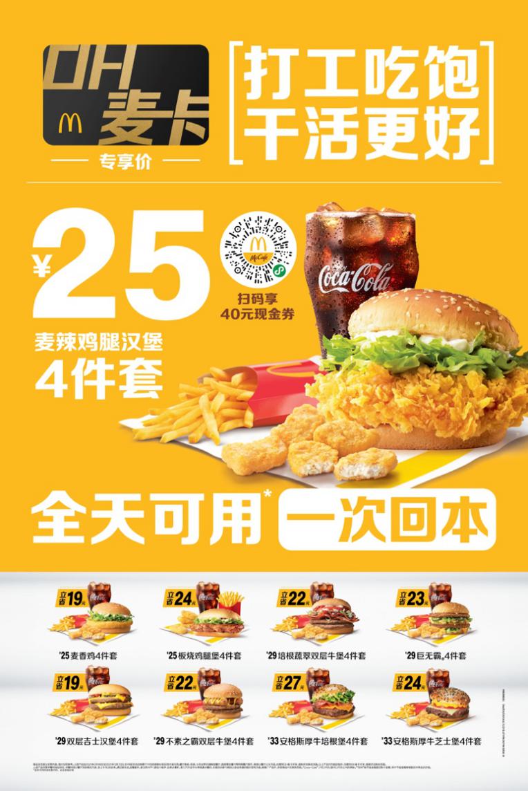 ? OH麥卡全新升級:調查發現67%的打工人愿意付費來獲得更大優惠。麥當勞OH麥卡職場卡升級多項權益,為打工人帶來25元招牌產品四件套、早餐麥滿分三件套6折、麥樂送免外送費及代金券等多種優惠。OH麥卡的權限覆蓋打工人生活中的多個場景,在到店取餐、麥樂送、麥咖啡等多個渠道都可以全天使用。