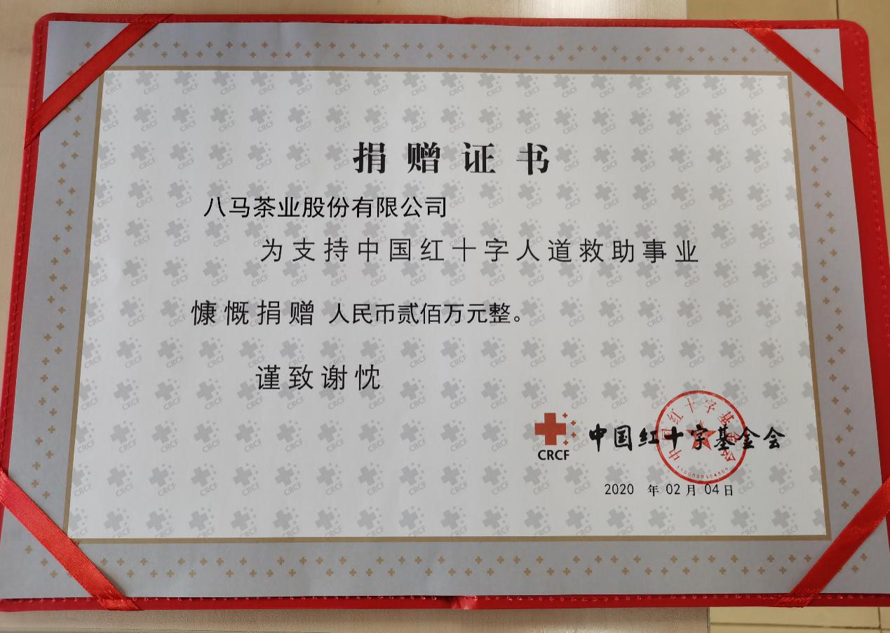 八馬茶業(yè)向中國紅十字基金會(huì)捐贈(zèng)人民幣200萬元,用于支援新型冠狀病毒感染的肺炎疫情防控及防疫一線醫(yī)務(wù)人員發(fā)放人道救助金等工作。