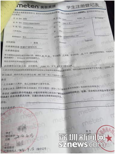 段女士告訴記者,2014年她在網(wǎng)上與美聯(lián)英語的客服人員取得聯(lián)系后,便前往南山區(qū)海印長城二期1-2層的美聯(lián)英語中心試聽課程,并于當(dāng)年4月報讀了M0—M4五個級別共31800元的課程。段女士當(dāng)時選擇的是分期付款方式,在完成首付3200元后,其余的金額由銀行每月自動扣除1100余元。截至目前,段女士已連續(xù)繳費22個月。