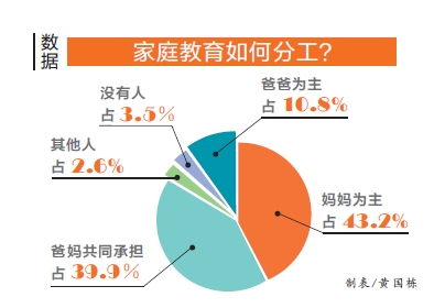 此次調查中,用14個指標考察家庭教育分工情況,包括:輔導孩子學習、培養孩子特長、接送孩子上下學、開家長會、培養孩子日常行為習慣、糾正孩子的不良行為、教孩子明辨是非、照顧孩子的飲食起居、和孩子一起游戲及和孩子聊天。統計數據顯示,家庭教育分工中,“媽媽為主”的家庭占43.2%,“爸爸為主”占10.8%,“爸媽共同承擔”占39.9%,“其他人做”占2.6%,“沒有人做”占3.5%。