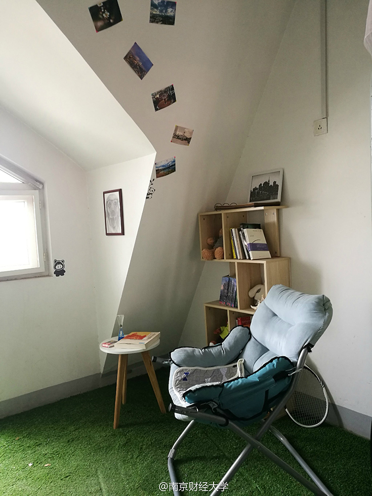 綿綿的草坪、充滿設計感的書架、掛著素描畫的墻……難以想象這是四個19歲男生的寢室。南京財經大學西苑9幢男生宿舍頂樓602寢室,住著4位“世外高人”—— 涂貴平、柯毅、劉以康和廉鎮宇,他們用事實告訴大家,男生宿舍文藝起來,可絲毫不輸女生。圖/@南京財經大學