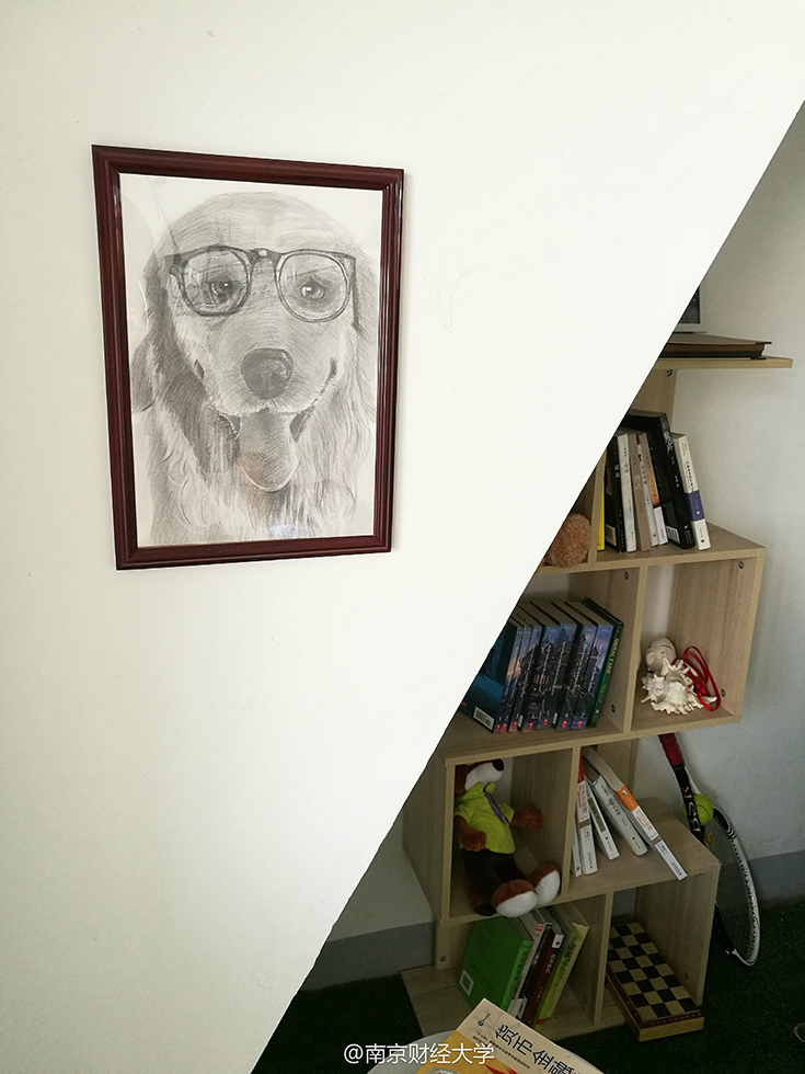 墻上一幅戴著眼鏡的小狗素描圖格外引人注目,它是由602舍長涂貴平親手畫的。“這幅畫還是去年自己參加了一個帶有公益性質的畫畫班學的,我也沒想到能畫成這樣。”來自貴州的涂貴平害羞地說,其實裝飾寢室的初衷很簡單,錢就花了300塊不到,主要是希望大學四年能住在干凈的環境。