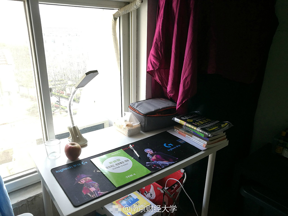 踏進宿舍大廳,地上碧綠的草坪讓人瞬間卸下疲乏,“這草坪是我秒殺的,花了150塊錢左右。”來自蘇州的柯毅笑著說,是自己最先提議讓宿舍“換裝”的,原因很簡單:上大學了,應該有屬于自己的小環境。除了草坪,602寢室還添置了書桌、躺椅、三腳桌……柯毅介紹道,“我最喜歡這個白色的三角桌,有北歐簡潔風,當時花了好久時間在網上找這類桌子,最后選了這個,50多元,性價比最高。