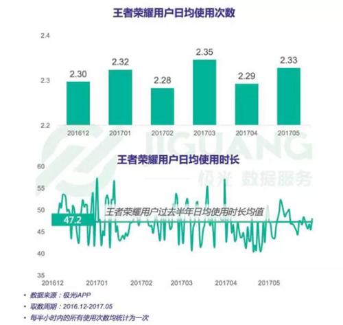 根據極光大數據的統計,《王者榮耀》用戶白天游戲高峰時段為12:00-13:00,占比為6.97%;晚間游戲高峰為21:00-23:00,共占比13.63%在過去的半年里《王者榮耀》日均使用次數在2.3次左右,日均使用時長基本在40~55分鐘這一區間。從此處來看,其用戶使用情況并沒有達到一個與常規游戲差異巨大的程度。