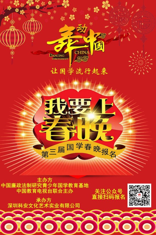 2019年第三屆國學春晚由青少年國學教育基地與中國教育電視臺聯合主辦,本次春晚打破以往以晚會為主導的籌辦模式,更注重國學文化的推廣及全民國學才藝的選拔。首次以主辦方的報道與宣傳規模在全國范圍內進行海選。以“舞動中國”為主題在全國范圍內進行強勢推廣,發出中國國學文化領域的最強音!在長達4個多月的宣傳活動期間,將不間斷運用活動背景、輻射人群、媒體資源、賽事平臺及網絡優勢等方式弘揚國學。