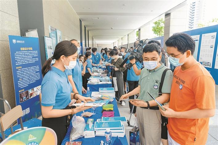 在沙盤處,考生和家長可以了解學校的整體規劃。深圳技術大學的建設規劃遵循開放、共享原則,建成后將形成三面環水的校園風光,“沒有圍墻的大學”“空中大學”的理念吸引著考生和家長。