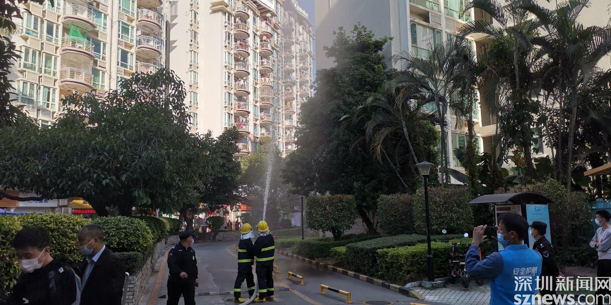 演練情景設定為巡查人員發現火情,第一時間向社區安全相關負責人匯報,安保處立刻報警并啟動消防應急預案。隨后火警警報驟響,樓道內冒出濃煙,疏散演練正式開始。居民們在工作人員的指揮下,用口罩、衣服等捂口鼻,屈膝彎腰沿著既定的疏散路線,迅速向安全區域撤離。隨后社區消防員趕赴現場,使用高壓水槍撲滅火災,解除警報。演練結束后,社區還組織居民參加安全體驗活動。