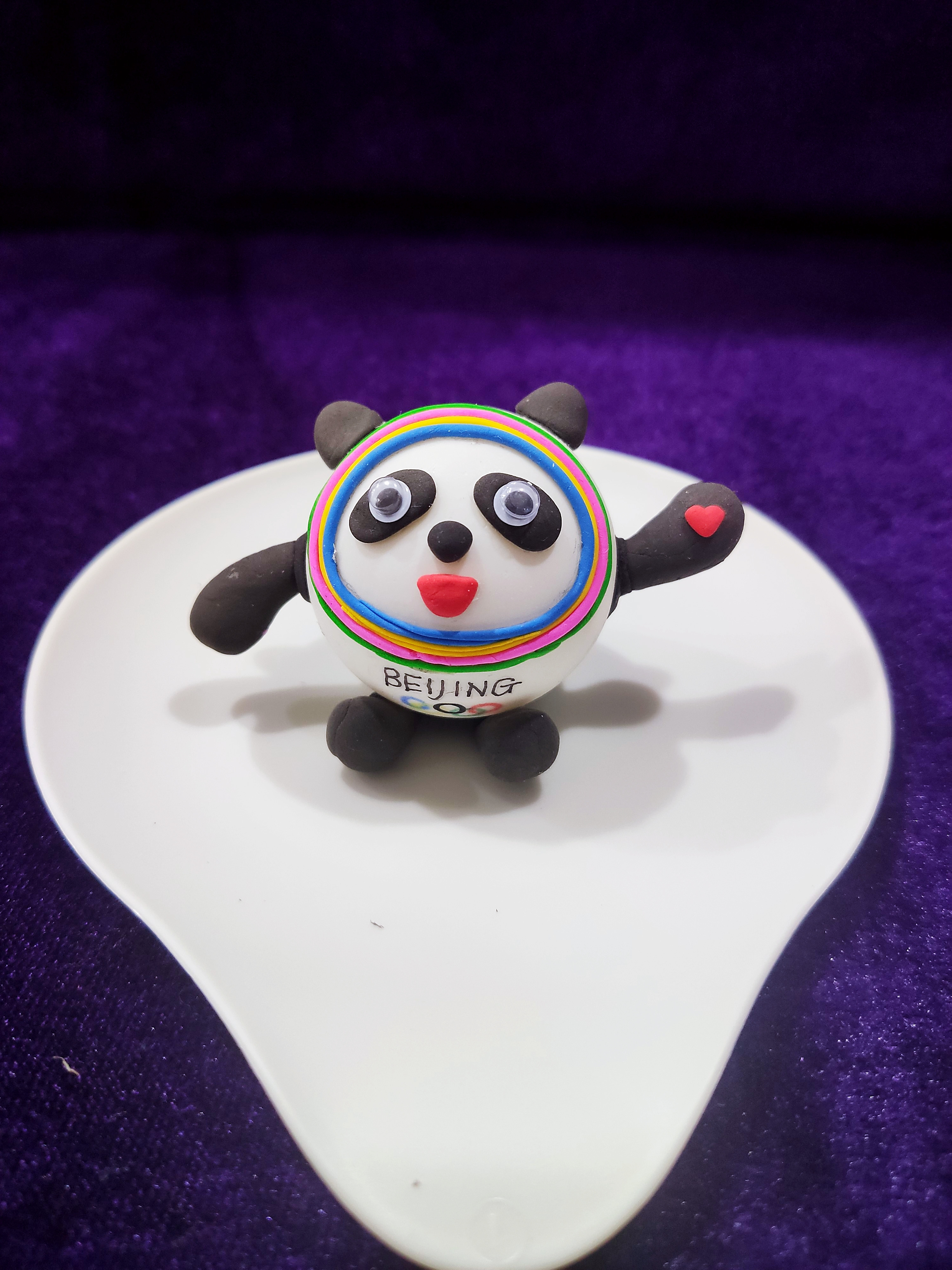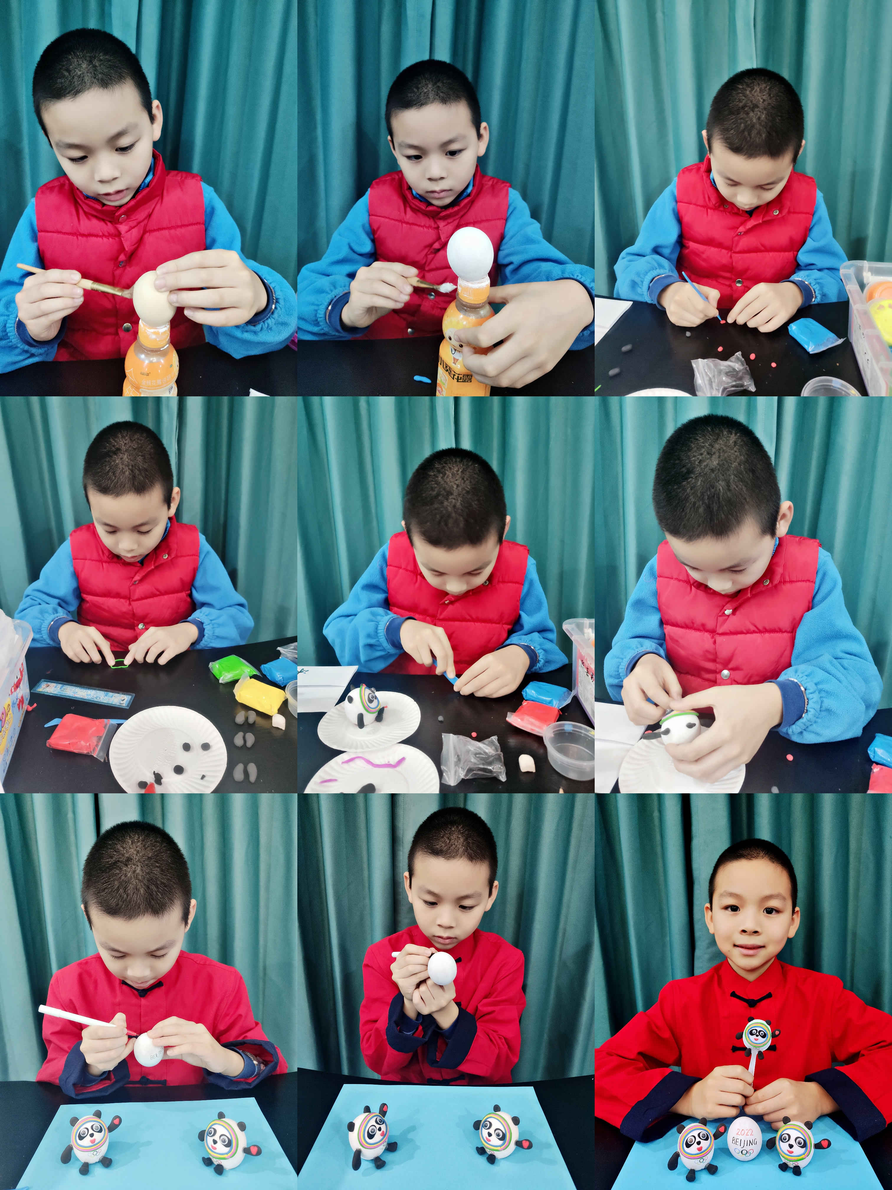 為了不讓蛋殼滾來(lái)滾去,我把蛋殼套到了瓶子上,第一步是給蛋殼刷上白色的顏料,晾干,再用輕黏土制作冰墩墩的五官和四肢。制作過(guò)程中,我遇到了難題——冰墩墩臉上的彩色光環(huán)可怎么做?我到到網(wǎng)上仔仔細(xì)細(xì)地觀察了冰墩墩的光環(huán),想到了解決辦法,最后我的蛋殼冰墩墩做好了。