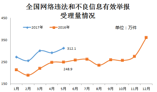 5月份,各地網信辦各網站深入貫徹落實2017年全國網絡舉報工作會議暨第三批百家網站公布舉報受理方式會議精神,同時在“六一”國際兒童節到來前,進一步加大對網上違法和不良信息,特別是淫穢色情等嚴重危害青少年身心健康有害信息的處置力度,受理違法和不良信息有效舉報312.1萬件,環比、同比分別增長約7.1%和25.4%。
