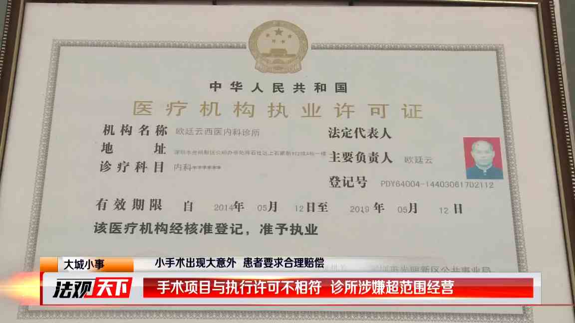 隨后,記者和醫調委吳毅主任來到了歐廷云診所,由于周女士身體尚未恢復,周女士丈夫張先生來到了這家位于光明新區上石家村的診所。此時負責人并未在店內,記者在店里掛出的《醫療機構執行許可證》看到,該診所的診療科目為內科,而取環手術卻是婦科項目,換言之,該診所涉嫌超范圍經營。隨后,吳主任電話與診所負責人取得了聯系。負責人表示,涉事醫生并非診所醫生,而是從其它診所請來的。