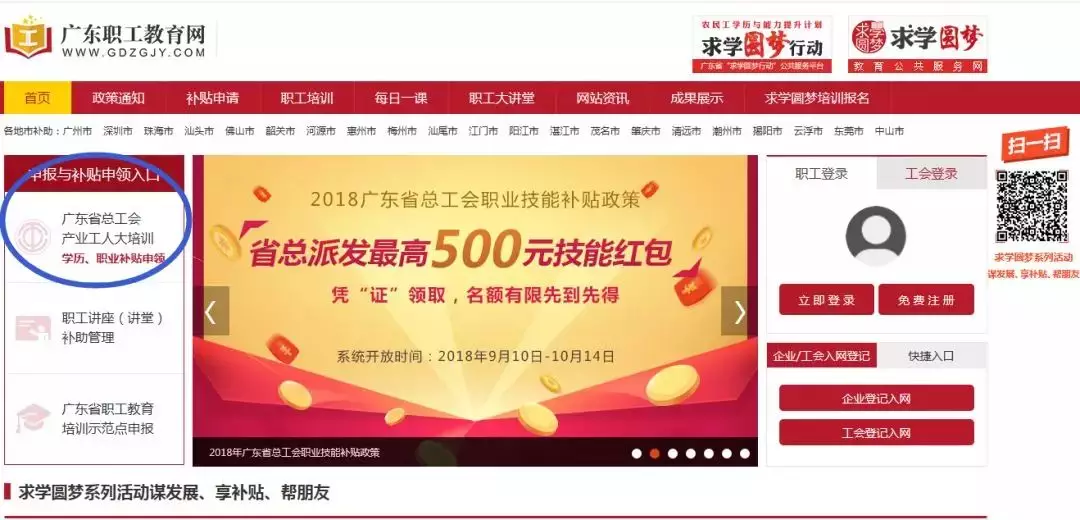 在網站(www.gdzgjy.com)首頁左側【申報與補貼申領入口】,點擊“廣東省總工會產業工人大培訓學歷、職業補貼申領”界面,選擇右側“職業技能提升補助”點擊【進入申領】。