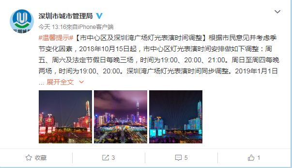 近期,深圳燈光秀表演刷屏朋友圈。今天(10月14日)13時,深圳市城市管理局發布通知稱,根據市民意見并考慮季節變化因素,10月15日起,深圳市中心區及深圳灣廣場燈光表演時間調整。
