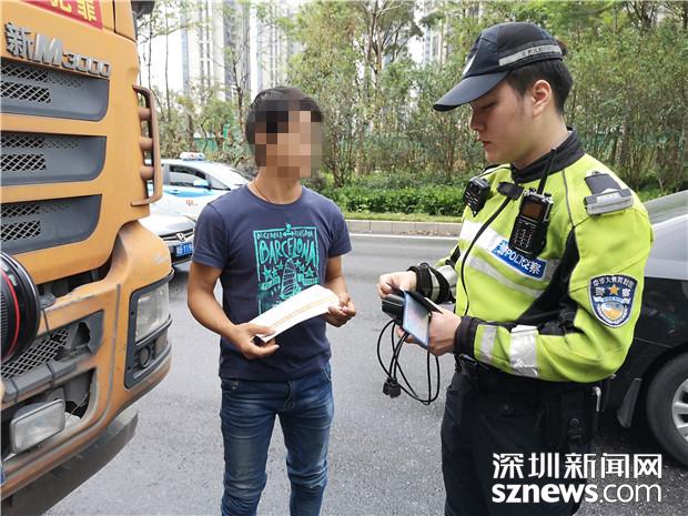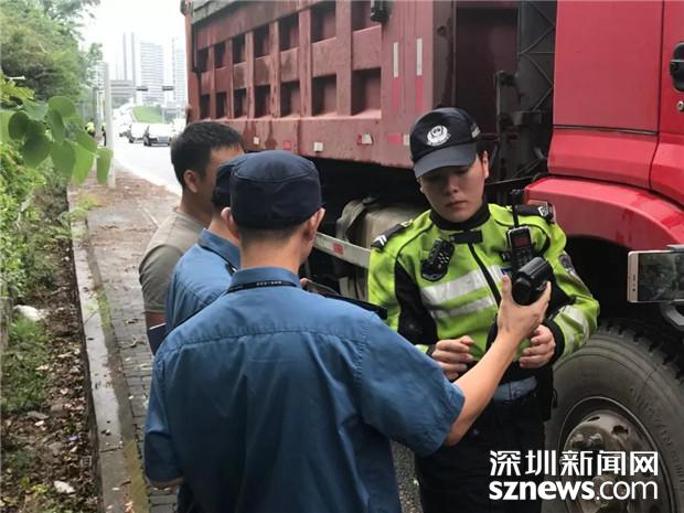 深圳交警民警檢查泥頭車駕駛員的相關證件