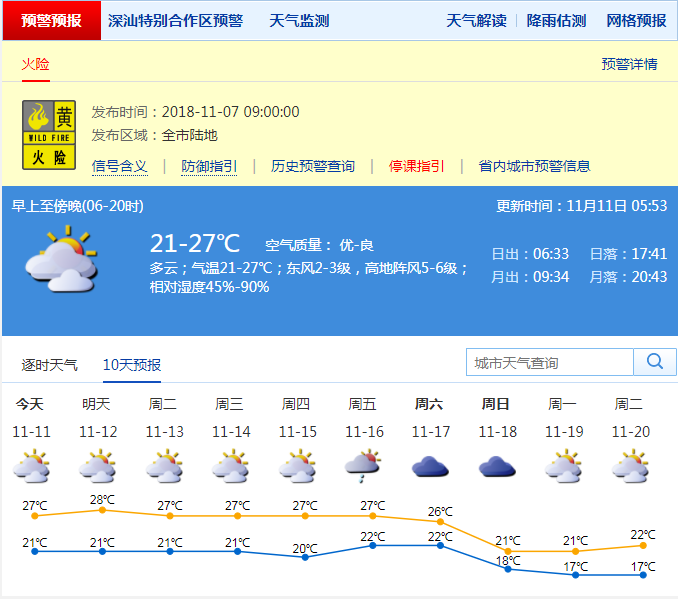 預計早晨7-9時,全市多云間陰天;氣溫21 ℃ -23 ℃,相對濕度75%-90%,輕微偏東風,能見度3-15公里。深圳市氣象臺2018年11月11日06:01發布。