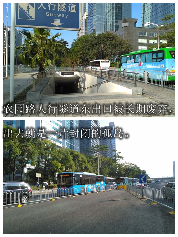 自2017年連通深南大道兩側,可供行人通行的人行天橋被拆卸后,行人都只能從人行隧道過街。但奇怪的是,人行隧道的東出口處是一片被隔離、被荒廢的“孤島”,這讓需要從此出口通行的市民很尷尬。即使避開這個出口,選擇繞行,又容易在農園路口與右轉車輛發生沖突。“真的很為難我們啊。”市民吳先生證實了步行通過該路段的“艱難”。