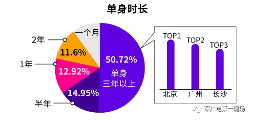 針對單身時長的調查發現,有高達50.72%的人為單身三年以上的“長單族”,“長單族”占比最多的城市前三為北京、廣州和長沙。