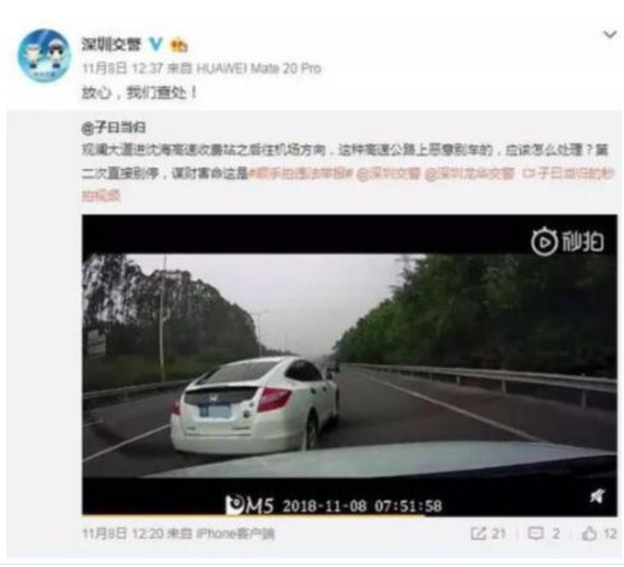 目前,深圳交警對舉報人(出租車司機)變線不使用轉向燈,影響其他車輛正常行駛的違法行為依法做出處罰;對被舉報人(大巴司機)處以5天行政拘留。