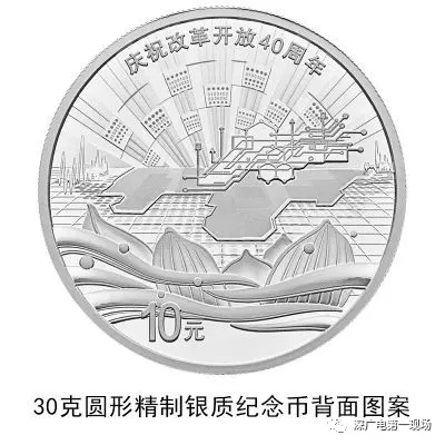 30克圓形銀質紀念幣背面圖案之二為深圳城市建筑、蛇口港、拓荒牛雕塑及飄帶等組合設計,并刊“慶祝改革開放40周年”字樣及面額。