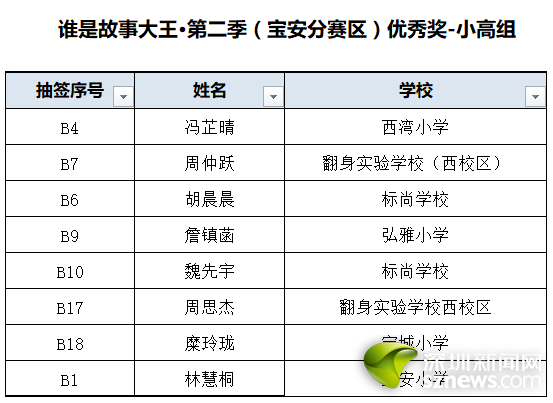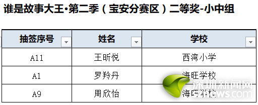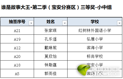 誰是故事大王·第二季(寶安分賽區)獲獎名單: