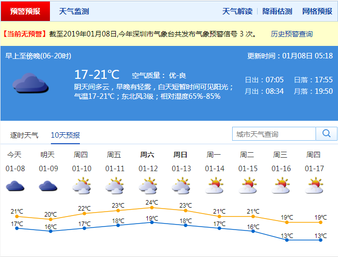 深圳市氣象局預計,8日陰天間多云,早晚有輕霧,短暫時間可見陽光;氣溫15-20℃;東北風3級;相對濕度65%-85% 。9-10日陰天間多云,偶有零星小雨,短暫時間可見陽光;11-14日多云間陰天,可見陽光,天氣溫暖,早晚能見度較差。