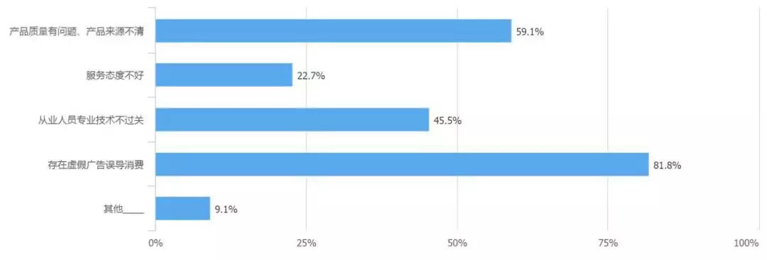 消費者們認為美容美發行業中存在最大的問題是虛假廣告誤導消費,第二則是產品質量問題和產品來源不清。