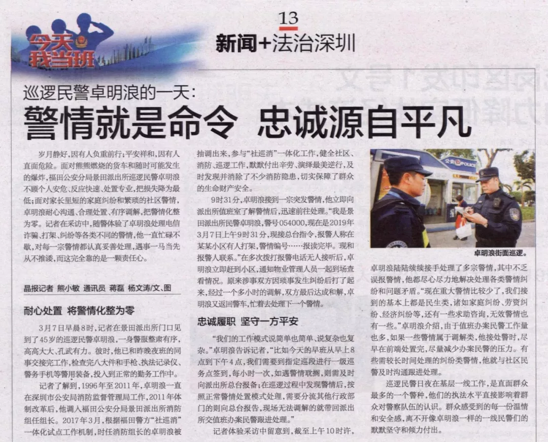 巡邏民警日夜在基層一線工作,是直面群眾最多的一個警種,他們的執(zhí)法水平直接影響著群眾對警察隊(duì)伍的認(rèn)識。群眾感受到的每一份溫情和安全感,離不開像卓明浪一樣的一線民警們的默默堅(jiān)守和傾力付出。