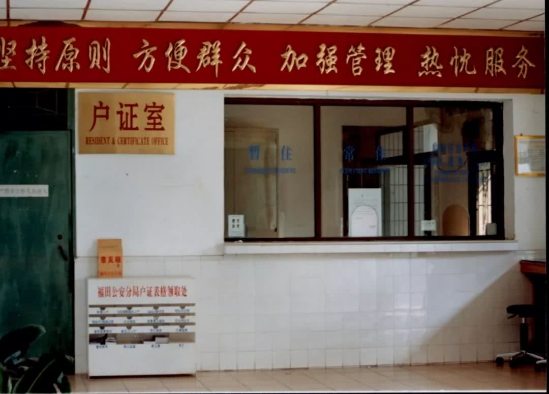照片中,在水泥門樓的一側掛著一塊政府機關牌匾,白底黑字落有“深圳市公安局福田派出所”幾個大字。門樓上的五星紅旗熠熠生輝,透過門樓,內部有個寬敞的小院,供巡邏車停放及日常操練,再往里走便是一幢3層樓高的辦公樓,辦公樓的中央懸掛一枚警徽,彰顯警隊的莊嚴。一樓是戶政室,一縷陽光透過窗戶灑進來,讓辦事的群眾感到溫暖,也給門欄上“堅持原則 方便群眾加強管理熱忱服務”16個字鍍上了金邊,這是福田派出所對轄區老百姓的堅定承諾。