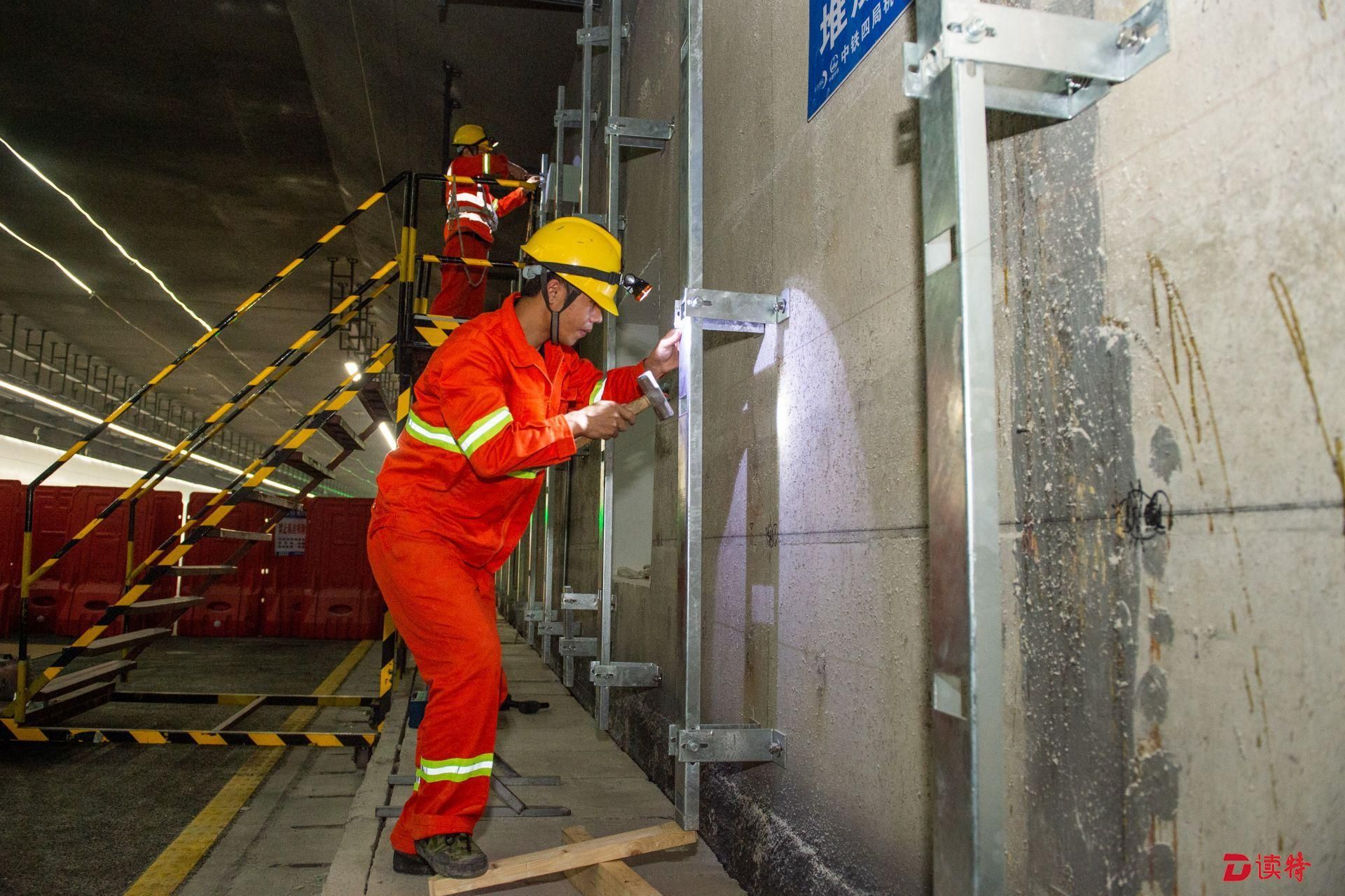 前海地下道路施工現場,工人安裝、校正搪瓷鋼板龍骨