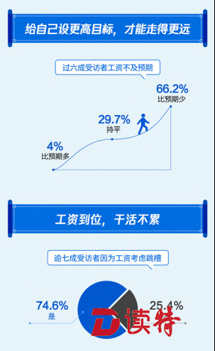 報告顯示,受經濟環境等因素影響,過六成受訪者工資不及預期,同時,工資水平影響了職場人的職業規劃,逾七成受訪者因為工資考慮跳槽;66.2%的受訪者工資水平比預期少,只有4%的受訪者認為工資比預期多,此外,逾七成受訪者認為工資是考慮跳槽的主要因素。