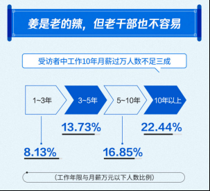 此外,受訪者月薪過萬人數與隨著工作年限遞增,但工作10年月薪高于1萬的人數依然不足三成。報告顯示,工作10年以上的受訪者中月薪過萬人數比例為22.44%、工作5-10年月薪過萬人數比例為16.85%、工作3-5年月薪過萬人數比例為13.73%、而工作1-3年月薪過萬人數比例是8.13%。這也從側面說明了工作經驗不是影響工資水平的唯一因素,想要得到高薪,經濟環境、工作地域、從事行業等因素也至關重要。