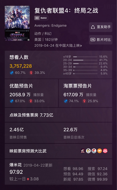深圳新聞網4月24日訊(記者 陳婕)相信你的朋友圈已經被“復聯4”占據了領地,而小記認識的英雄還湊不齊一桌麻將。截至24日00點,《復仇者聯盟4》預售已破7億!超《美國隊長2》總票房,在《復聯4》的預售峰值期,淘票票預售市場占比過半。