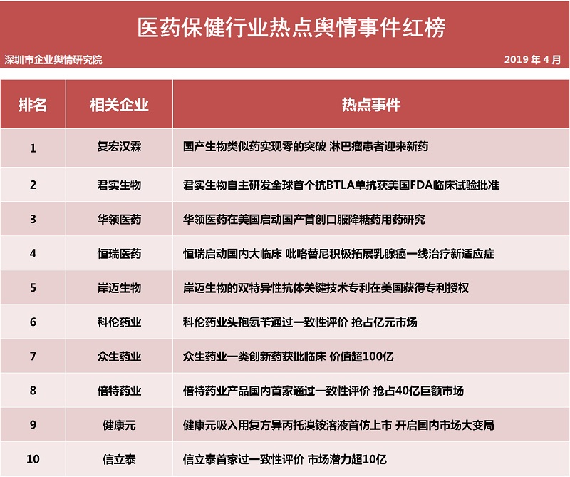深圳新聞網2019年5月7日訊 (記者田志強 通訊員陳文光)5月7日,深圳企業輿情研究院發布第十四批企業輿情榜單。本次榜單重點聚焦房地產及醫藥保健兩個行業。醫藥保健行業輿情榜單由醫療保健行業熱點輿情事件排行榜(紅、黑榜)及醫藥保健行業企業公眾形象排行榜組成。