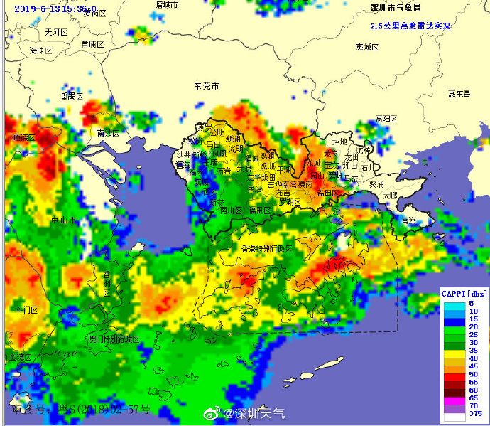 預計全市1-2小時內將出現20-40毫米局部50毫米降水,深圳市氣象臺于2019年06月13日08時將暴雨黃色預警擴展至全市,全市處于暴雨戒備狀態,請注意防范。