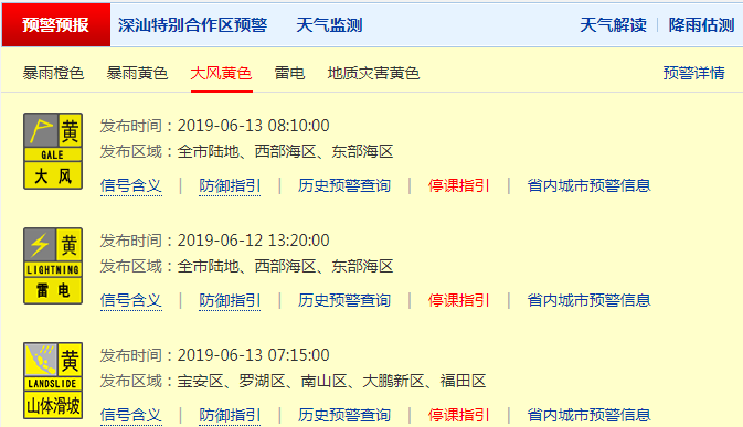 【深圳市地質災害氣象風險預警2019年第17號】根據目前降雨情況,結合我市地質環境條件,現對全市陸地發布地質災害氣象風險黃色預警,氣象因素致上述地區發生地質災害的風險較高,請相關部門和單位做好地質災害各項防御工作。