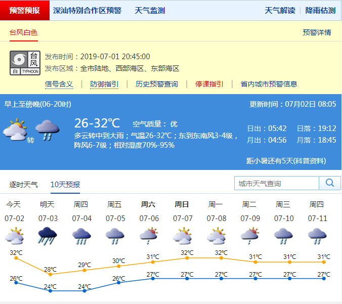 深圳新聞網2019年07月02日訊 深圳市氣象臺已于昨日20時45分發布臺風白色預警信號,預計其將可能在48小時內影響我市,全市進入臺風注意狀態。氣象臺預計,今日白天深圳風力逐漸加大,最大陣風7級左右,午后降雨漸趨頻密,局部大雨,夜間降雨加大,有大雨到暴雨,局部大暴雨,請做好防范準備!