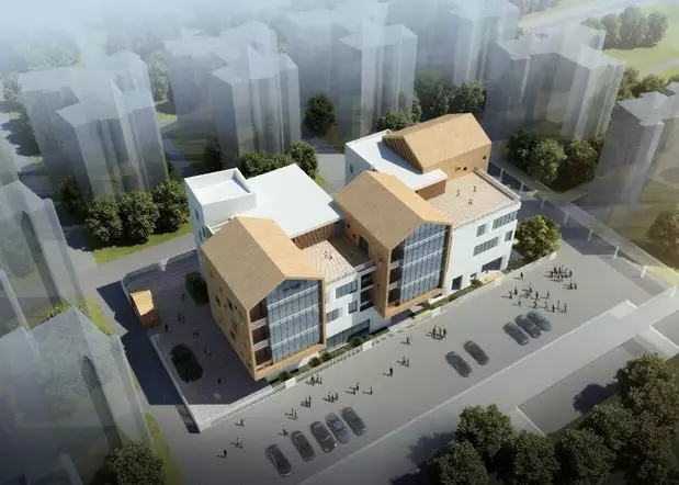 建筑造型簡潔現(xiàn)代,在白色體量上嵌入三個木色坡屋頂體塊,如積木城堡一般,富有童趣,建筑設有集中活動平臺作為補充。