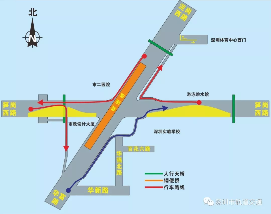 黃木崗路口南轉東向(華富路轉筍崗西路)、東轉北向(筍崗西路轉泥崗西路)不在通過平交路口,改為通過輔道進行右轉。(詳見圖4)