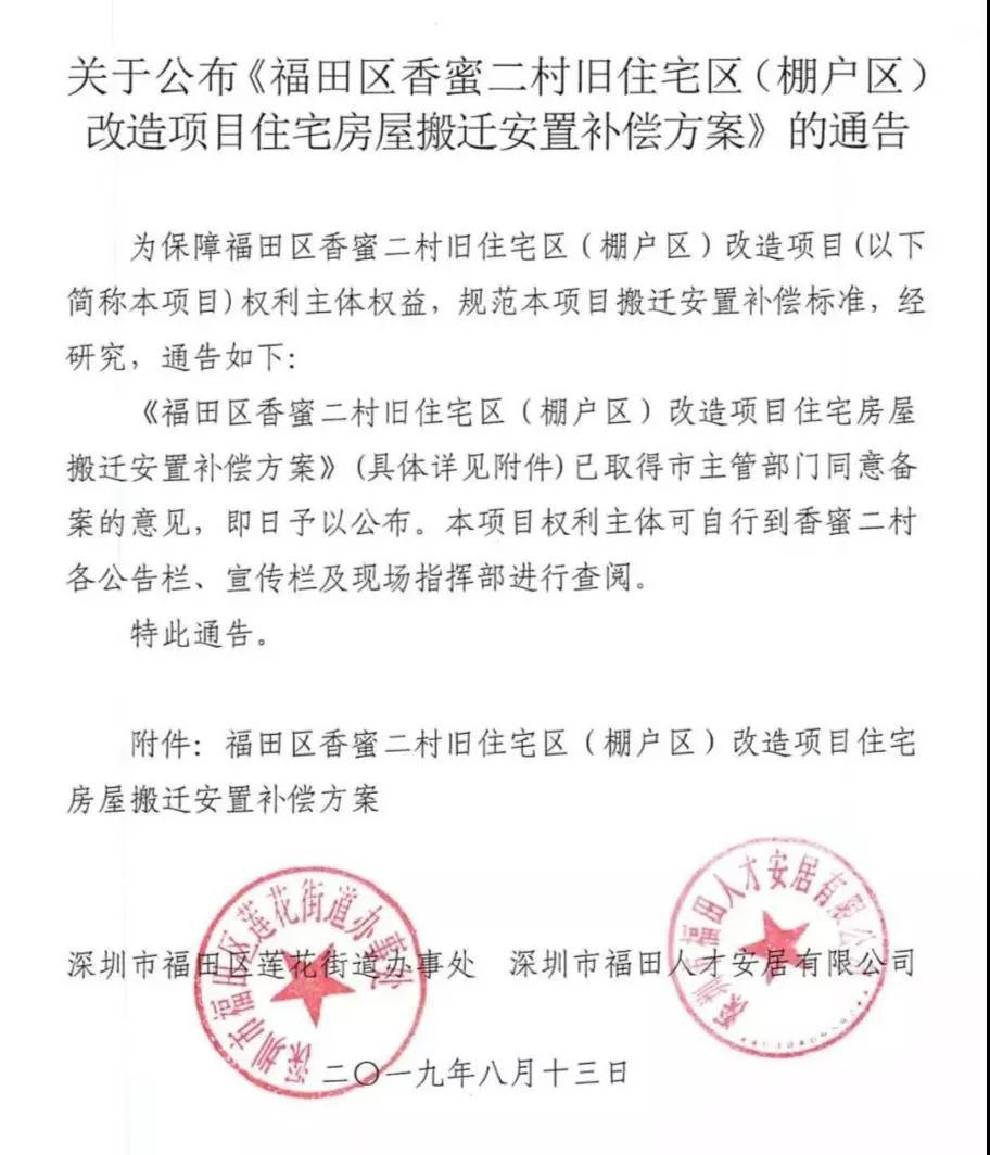 晶報2019年8月19日訊 8月13日,深圳市福田區蓮花街道辦事處和深圳市福田人才安居有限公司聯合發布"關于公布《福田區香蜜二村舊住宅區(棚改區)改造項目住宅房屋搬遷安置補償方案》的通告"。