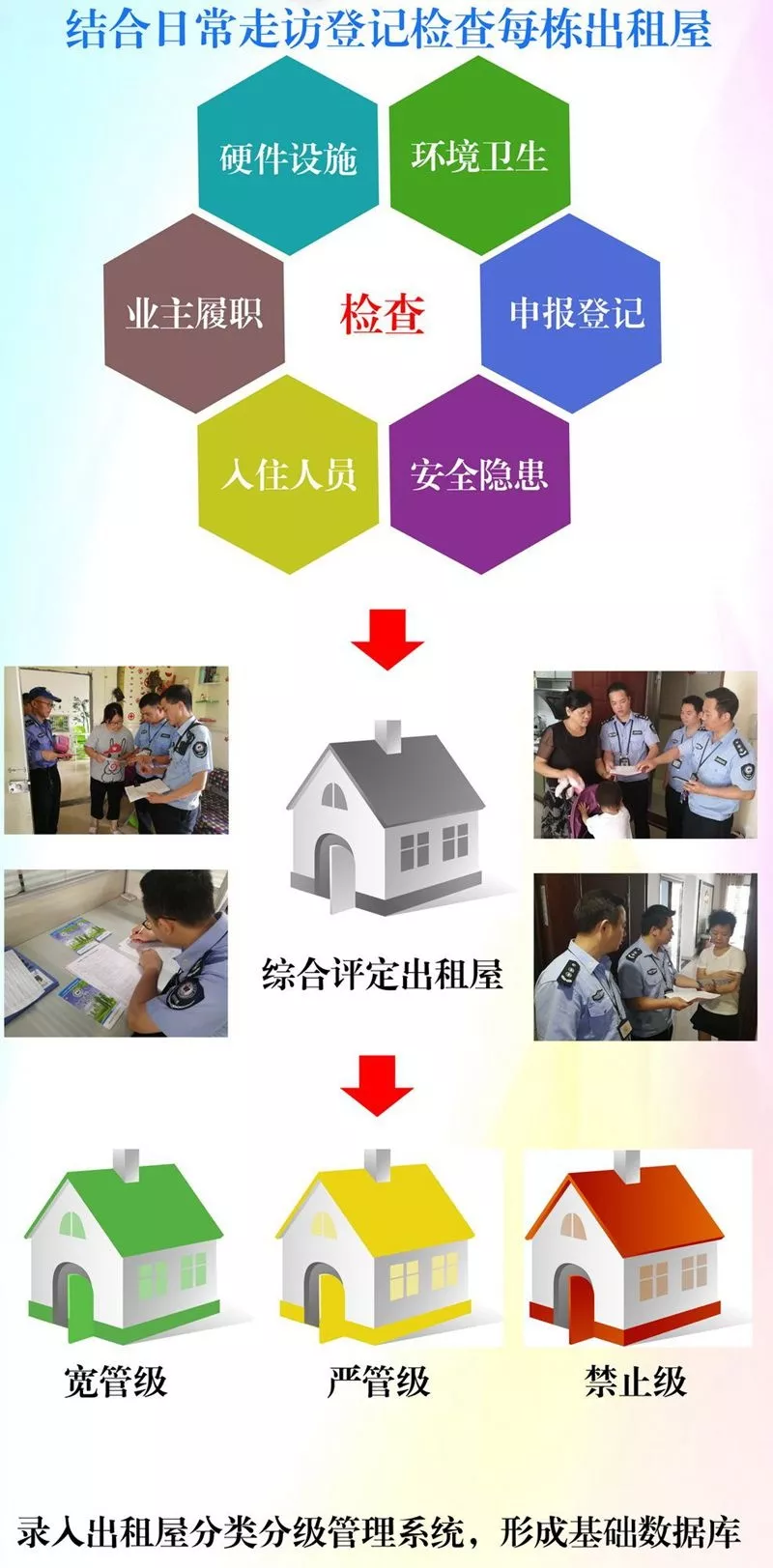 嚴(yán)格管理。社區(qū)巡查力量對(duì)嚴(yán)管級(jí)出租屋每周走訪巡查一次,發(fā)現(xiàn)義務(wù)申報(bào)人未按要求申報(bào)居住信息、發(fā)現(xiàn)各類安全隱患信息及時(shí)通報(bào)有關(guān)職能部門處置。