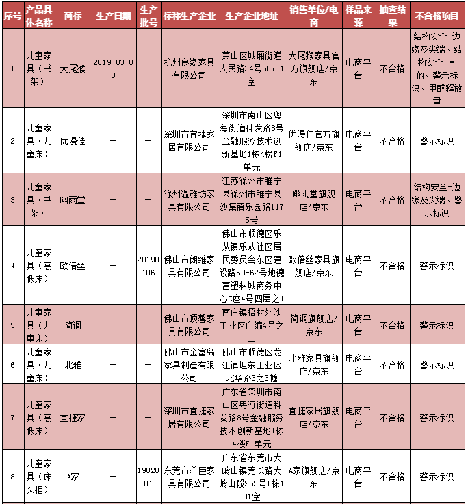 晶報2019年9月12日訊 本次抽查結果顯示,不合格樣品的商標涉及大尾猴、優漫佳、幽雨堂、歐倍絲、簡調、北雅、宜捷家、A家、蘭泊斯尼、富博、鑫宏賽、歡樂頌、BLBH/百倫百煥、簡心、我愛川威、皇主(HUANGZHU)、Alljoy、芭比城堡、格蘭大道、楓柏鴻韻、柏木居、蘇潤、祺藝、槿墨閣、陽光明珠,等等。其中,深圳有4批樣品上“黑名單”,涉3家企業,它們分別是:深圳市宜捷家居有限公司、深圳市鼎順達家具有限公司、深圳市一鳴實業有限公司。
