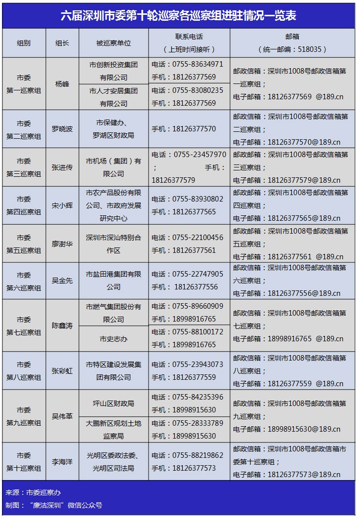 六屆深圳市委第十輪巡察完成進駐 各巡察組聯系方式公布