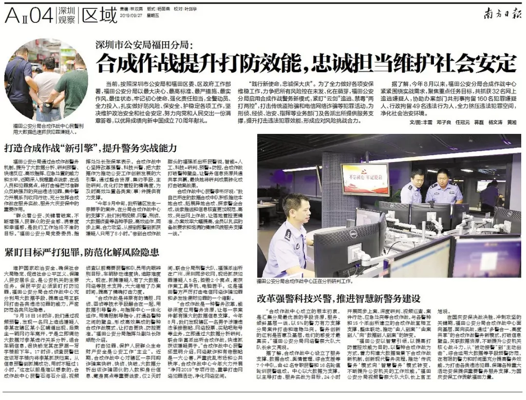 在大慶安保決戰(zhàn)決勝、沖刺攻堅(jiān)的關(guān)鍵期,福田公安分局合成作戰(zhàn)中心面向基層、面向?qū)崙?zhàn),通過“多警合一、高度共享”的合成作戰(zhàn)警務(wù)新模式,打破信息壁壘,關(guān)聯(lián)數(shù)據(jù)資源,不斷提升公安機(jī)關(guān)核心戰(zhàn)斗力,從“被動接警”到“主動出擊”,綜合運(yùn)用大數(shù)據(jù)等手段預(yù)警防范,為在有限的警力和時間里充分提高警務(wù)效能,為打擊各類違法犯罪、保障各種重大活動安保提供重要警務(wù)服務(wù)支撐,為大慶安保工作貢獻(xiàn)福田力量。