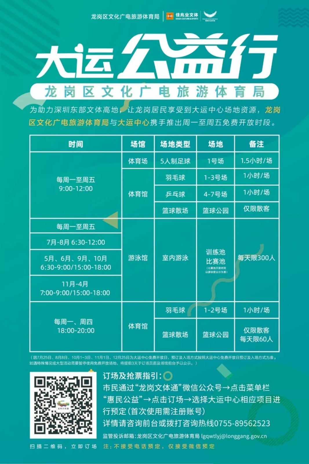此外,龍崗區文化廣電旅游體育局與大運中心攜手推出的文體惠民開放項目周一至周五每天免費開放半天持續進行中,具體時間及搶票攻略如下: