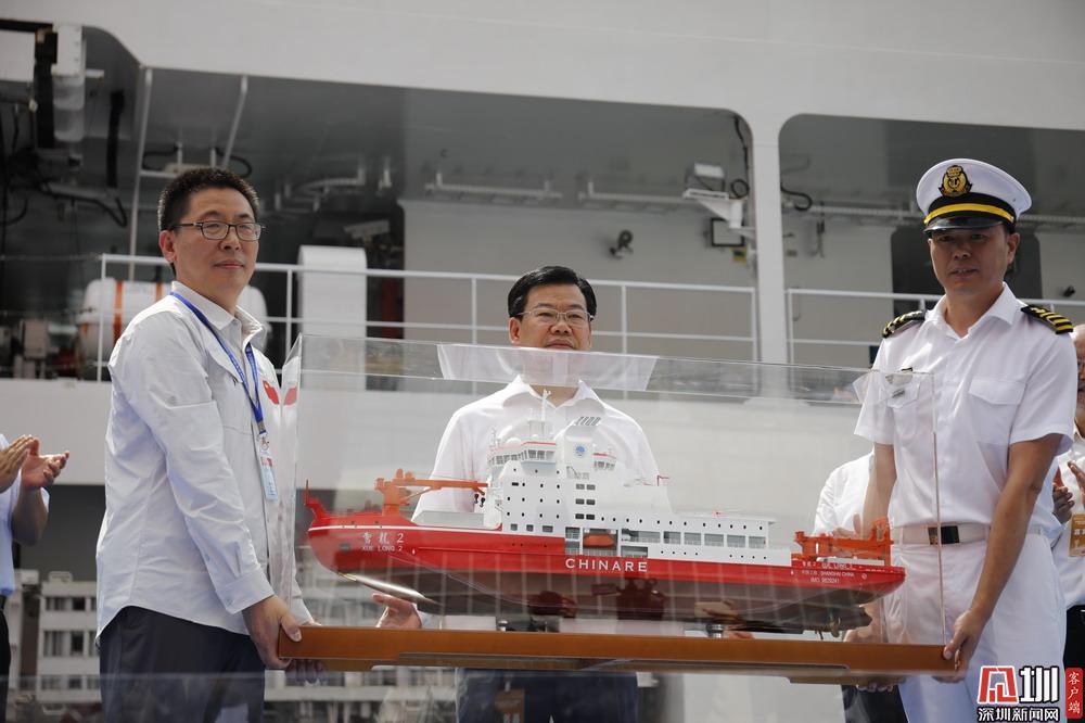在活動現場,南極科考隊向深圳市人民政府贈送了比例1:100“雪龍2”號船船模紀念品,隨后,南極科考隊向招商局集團贈送全體科考隊員簽名的隊旗等。此外,黃敏副市長率隊登船參觀、慰問考察隊員,并與考察隊員親切交流座談。